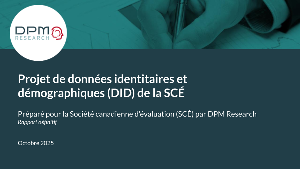Le projet a été mené par DPM Research et piloté par un sous-comité du Comité permanent Équité, Diversité et Inclusion de la SCÉ afin de garantir sa conformité avec les valeurs et les priorités stratégiques de la Société. Il fournit des données probantes permettant à la SCÉ de prendre des décisions éclairées quant à la mise en œuvre de la collecte de données DID.