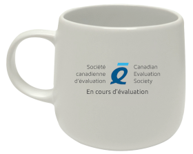 Tasse blanche en céramique avec le logo de la SCÉ et la mention « Progrès en évaluation ».